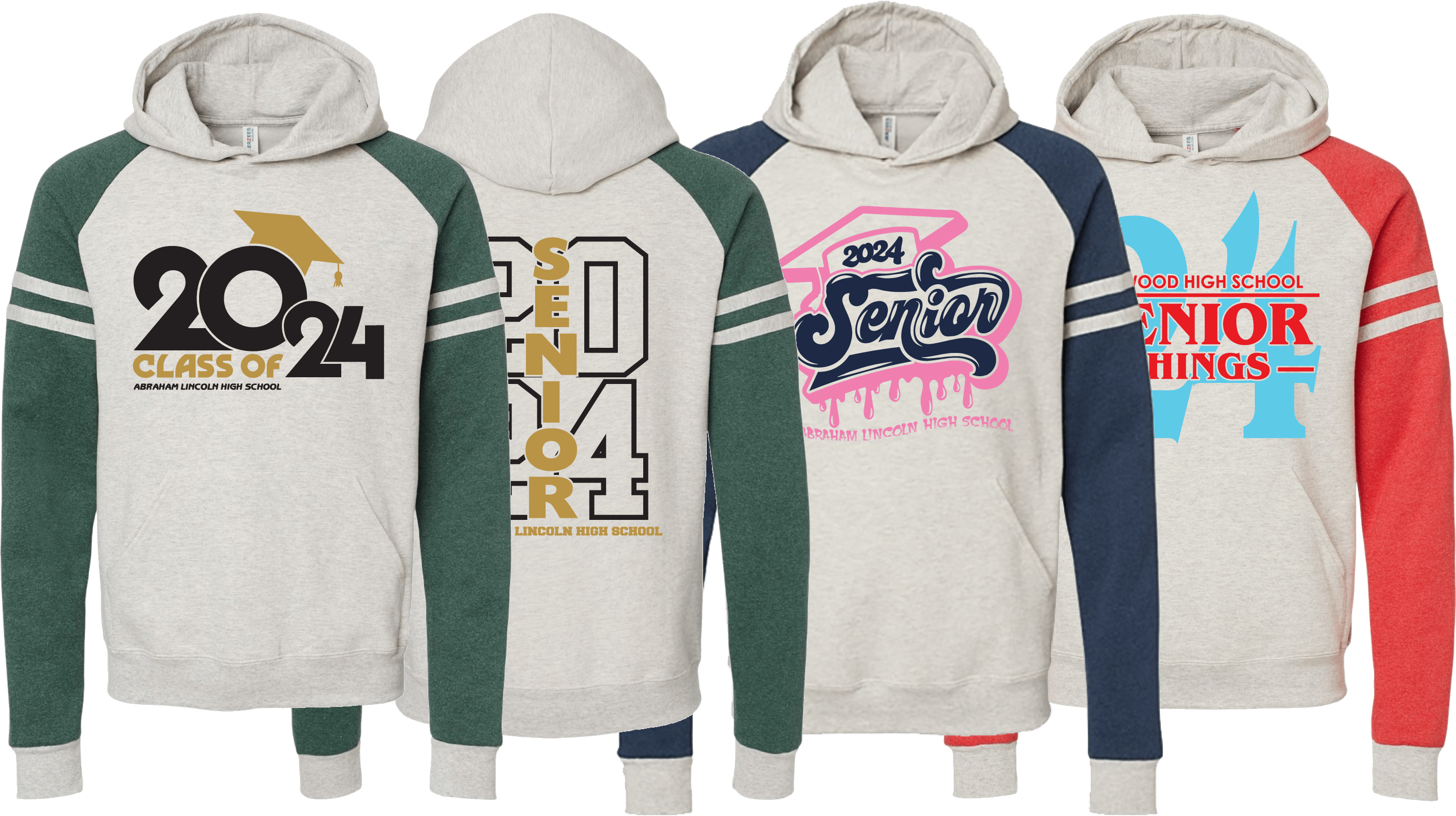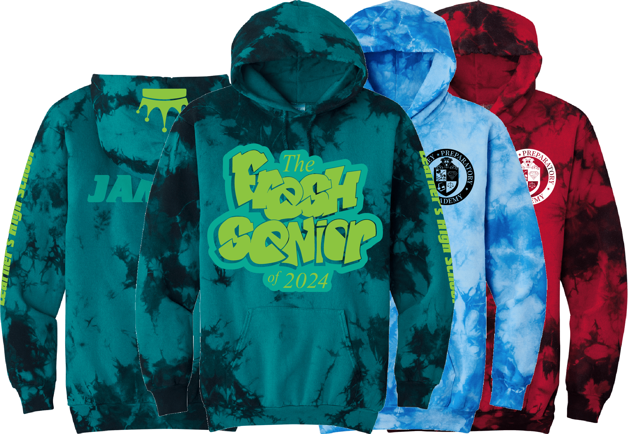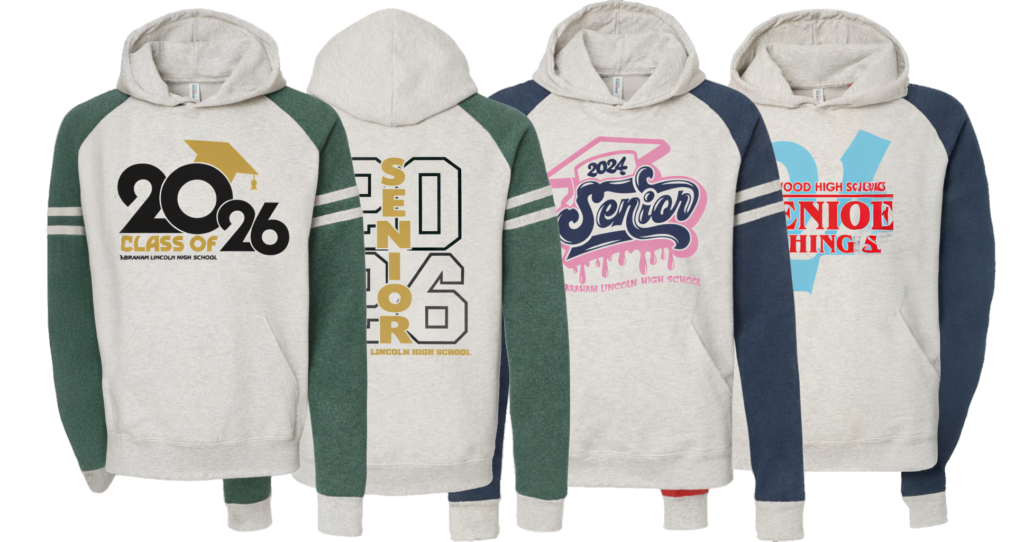 Choose your hoodie style, garment color and then print locations. We can print small on the left chest, full front, all over the back, the sleeves, pockets and hood so you can control the entire design. Personalize each one with student names or ask about our special print capabilities to really stand out.
