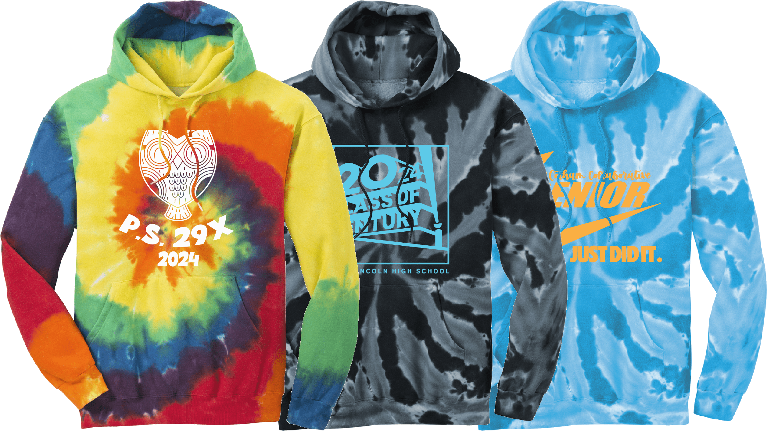 Tie dye hoodies come in swirl and crystal with a wide selection of colors. Their mottled range of colors make even simple, one-color print designs look great.